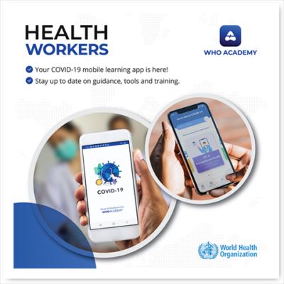 ವಿಶ್ವ ಆರೋಗ್ಯ ಸಂಸ್ಥೆ (WHO) ಇತ್ತೀಚಿನ COVID-19 ಮಾರ್ಗದರ್ಶನ ಮತ್ತು ನವೀಕರಣಗಳನ್ನು ಒದಗಿಸಲು ಮೊಬೈಲ್ ಅಪ್ಲಿಕೇಶನ್ ಅನ್ನು ಪ್ರಾರಂಭಿಸಿದೆ. COVID-19 ನವೀಕರಣಗಳ ಶೀರ್ಷಿಕೆಯೊಂದಿಗೆ ಅಪ್ಲಿಕೇಶನ್ ಆರೋಗ್ಯ ತಜ್ಞರಿಂದ ವೈರಸ್ ಬಗ್ಗೆ ವಿಶ್ವಾಸಾರ್ಹ ಮಾಹಿತಿಯನ್ನು ಒದಗಿಸುತ್ತದೆ. ಆದಾಗ್ಯೂ ಇದು ಜಗತ್ತಿನಾದ್ಯಂತ ಹಲವಾರು ಸರ್ಕಾರಗಳು ಬಿಡುಗಡೆ ಮಾಡಿದ ಅಪ್ಲಿಕೇಶನ್ಗಳಲ್ಲಿ ಸಾಮಾನ್ಯವಾಗಿ ಕಂಡುಬರುವ ಸಂಪರ್ಕ ಪತ್ತೆಹಚ್ಚುವಿಕೆ ಸೇರಿದಂತೆ ವೈಶಿಷ್ಟ್ಯಗಳನ್ನು ನೀಡುವುದಿಲ್ಲ. ಡಬ್ಲ್ಯುಎಚ್ಒ ಆರಂಭದಲ್ಲಿ ಏಪ್ರಿಲ್ನಲ್ಲಿ ತನ್ನ ಕೊರೊನಾವೈರಸ್-ಫೋಕಸ್ಡ್ ಮೊಬೈಲ್ ಅಪ್ಲಿಕೇಶನ್ ಅನ್ನು ತಂದಿತು.