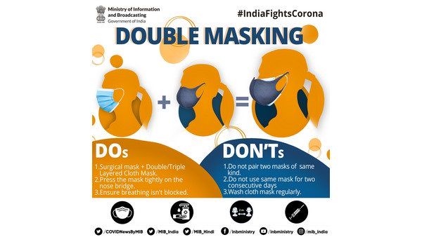 -ಡಬಲ್ ಮಾಸ್ಕ್ ಎಂದರೆ ಇದು ಸರ್ಜಿಕಲ್ ಮಾಸ್ಕ್ ಆಗಿರಬೇಕು ಒಂದೇ ಮಾಸ್ಕ್ 2-3 ಪದರ ಹೊಂದಿರಬೇಕು.