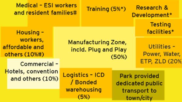 ಬೃಹತ್ ಸಮಗ್ರ ಜವಳಿ ವಲಯ ಮತ್ತು ಉಡುಪು ಉದ್ಯಾನಗಳ ಪ್ರಮುಖ ಘಟಕಗಳು ಶೇ.5 ಪ್ರದೇಶವನ್ನು ಸೂಚಿಸುತ್ತವೆ, ಆ ಉದ್ದೇಶಕ್ಕಾಗಿ ಬಳಸುವ ಶೇ.10 ಪ್ರದೇಶವನ್ನು ಸೂಚಿಸುತ್ತದೆ.