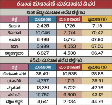 3.05 ಲಕ್ಷ ಮತದಾರರಲ್ಲಿ 1.59 ಲಕ್ಷ ಮತದಾರರು ಹಕ್ಕು ಚಲಾಯಿಸಿದ್ದಾರೆ. ಕೊಡಗಿನಲ್ಲಿ ಗರಿಷ್ಠ (ಶೇ 71.18) ಹಾಗೂ ಬೆಂಗಳೂರು ನಗರ ಜಿಲ್ಲೆಯಲ್ಲಿ ಕನಿಷ್ಠ (ಶೇ 28.88) ಮತದಾನ ನಡೆದಿದೆ. ಹೆಚ್ಚು ಮತದಾರರು ಇರುವ ಕಡೆ ಕಡಿಮೆ ಪ್ರಮಾಣದಲ್ಲಿ ಮತದಾನವಾಗಿದೆ.