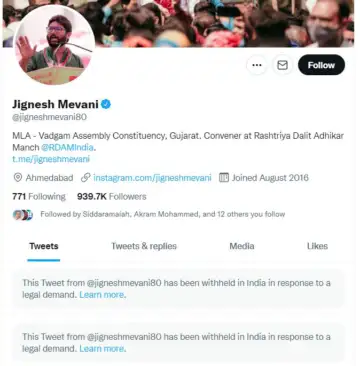 ಜಿಗ್ನೇಶ್ ಮೆವಾನಿ (@jigneshmevani80) ಅವರು ಮಾಡಿರುವ ಎರಡು ಟ್ವೀಟ್ಗಳನ್ನು ಟ್ವಿಟರ್ ಭಾರತದಲ್ಲಿ ತಡೆಹಿಡಿದಿದೆ.