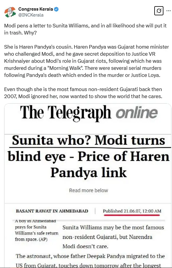 'ಮೋದಿ ಅವರು ಸುನಿತಾ ವಿಲಿಯಮ್ಸ್ ಅವರಿಗೆ ಪತ್ರ ಬರೆದಿದ್ದಾರೆ. ಅವರು ಅದನ್ನು ಕಸದ ಬುಟ್ಟಿಗೆ ಹಾಕುವ ಸಾಧ್ಯತೆಯಿದೆ. ಯಾಕೆ? ಸುನಿತಾ ಅವರು ಹರೇನ್ ಪಾಂಡ್ಯ ಅವರ ಸಹೋದರ ಸಂಬಂಧಿ. ಗುಜರಾತ್ನ ಗೃಹ ಸಚಿವರಾಗಿದ್ದ ಹರೇನ್ ಪಾಂಡ್ಯ ಅವರು ಗೋಧ್ರಾ ರೈಲು ಹತ್ಯಾಕಾಂಡದ ಸಂದರ್ಭದಲ್ಲಿ ಮೋದಿ ವಿರುದ್ಧವೇ ನಿಂತಿದ್ದರು. ಗಲಭೆಯಲ್ಲಿ ಮೋದಿ ಪಾತ್ರದ ಬಗ್ಗೆ ನ್ಯಾಯಮೂರ್ತಿ ವಿ.ಆರ್. ಕೃಷ್ಣಯ್ಯರ್ ಅವರಿಗೆ ರಹಸ್ಯವಾಗಿ ತಿಳಿಸಿದ್ದರು. ಇದಾದ ಬಳಿಕ ಪಾಂಡ್ಯ ಅವರ ಹತ್ಯೆಯಾಗಿತ್ತು'.