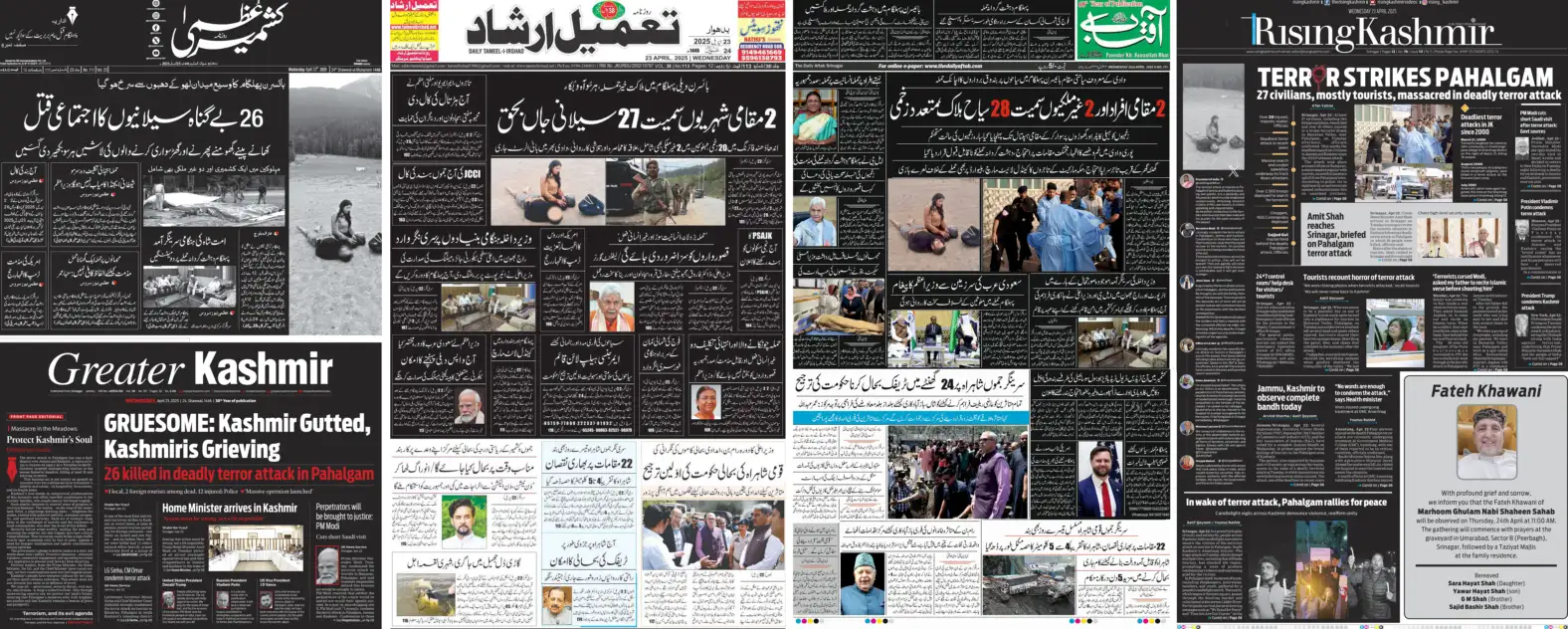 ಕಾಶ್ಮೀರದ ವಿವಿಧ ಪತ್ರಿಕೆಗಳು ಬುಧವಾರ ತಮ್ಮ ಮುಖಪುಟವನ್ನು ಕಪ್ಪು ಬಣ್ಣವನ್ನು ಬಳಸಿ ವಿನ್ಯಾಸ ಮಾಡಿದ್ದವು -ಪಿಟಿಐ ಚಿತ್ರಮೆಹೆಬೂಬಾ ಮುಫ್ತಿ ಪಿಡಿಪಿ ಮುಖ್ಯಸ್ಥೆಕಾಶ್ಮೀರದವರಾದ ನಮಗೆ ನಾಚಿಕೆಯಾಗಿದೆ. ಈ ದೇಶದ ಜನರಲ್ಲಿ ನಾನು ಕ್ಷಮೆ ಕೇಳಲು ಬಯಸುತ್ತೇನೆ. ನಮಗೆ ಅತೀವ ದುಃಖವಾಗಿದೆ. ಸರ್ಕಾರವು ತಪ್ಪಿತಸ್ಥರಿಗೆ ಕಠಿಣ ಶಿಕ್ಷೆ ನೀಡಬೇಕು