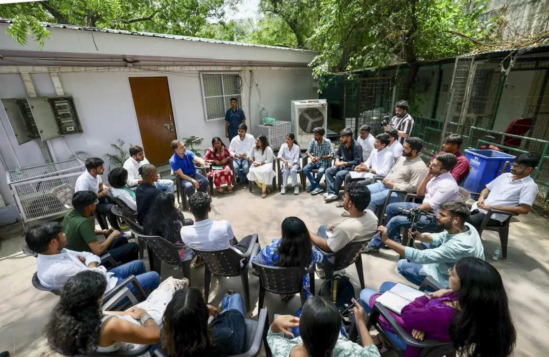 ಲೋಕಸಭೆಯಲ್ಲಿ ವಿರೋಧ ಪಕ್ಷದ ನಾಯಕ ರಾಹುಲ್ ಗಾಂಧಿ ಅವರು ಇತ್ತೀಚೆಗೆ ದೆಹಲಿ ವಿಶ್ವವಿದ್ಯಾಲಯ ವಿದ್ಯಾರ್ಥಿ ಸಂಘಟನೆ (ಡಿಯುಎಸ್ಯು) ವಿದ್ಯಾರ್ಥಿಗಳೊಂದಿಗೆ ಸಂವಾದ ನಡೆಸಿದ್ದರು -ಪಿಟಿಐ ಚಿತ್ರ **EDS: THIRD PARTY IMAGE** In this image released by AICC on Tuesday May 27 2025 Leader of Opposition in the Lok Sabha Rahul Gandhi during a meeting with DUSU students in New Delhi. Gandhi alleged that qualified SC/ST/OBC candidates are being deliberately disqualified and kept away from leadership roles. (AICC/PTI Photo) (PTI05_27_2025_000070B)