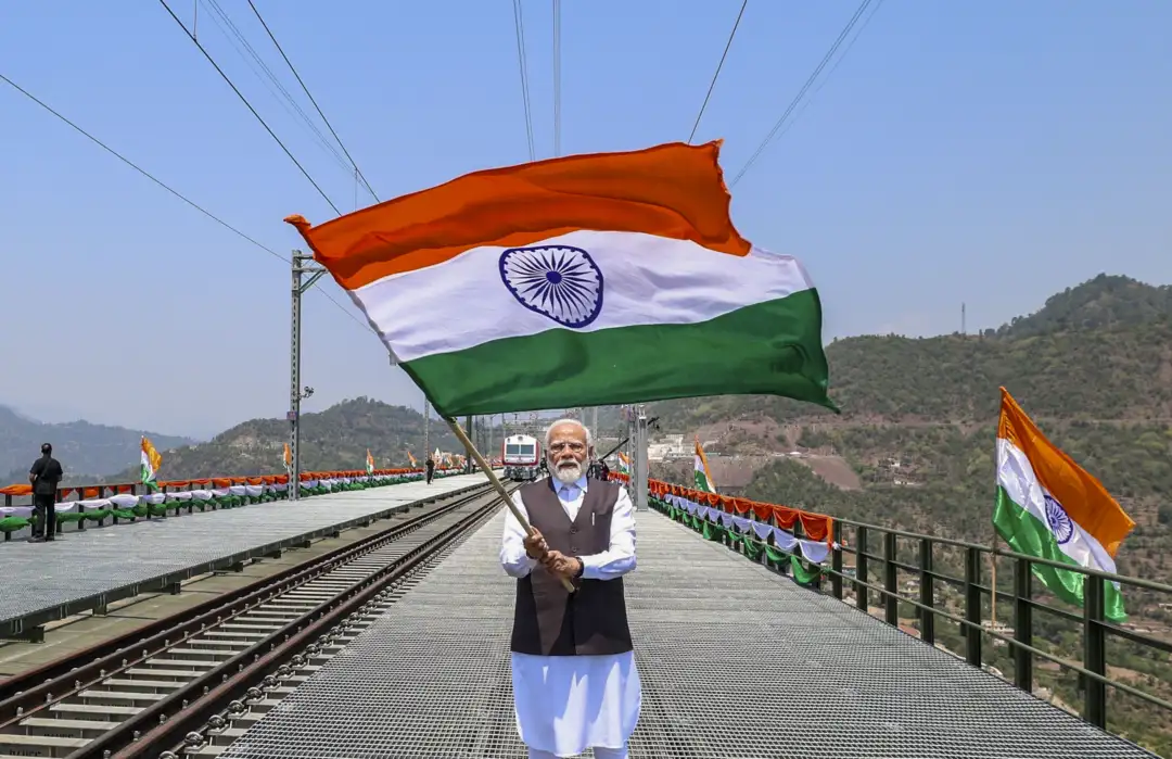 ಚೆನಾಬ್ ರೈಲ್ವೆ ಸೇತುವೆಯನ್ನು ಉದ್ಘಾಟಿಸಿದ ನಂತರ ಪ್ರಧಾನಿ ನರೇಂದ್ರ ಮೋದಿ ರಾಷ್ಟ್ರ ಧ್ವಜ ಹಿಡಿದು ಸೇತುವೆ ಮೇಲೆ ಶುಕ್ರವಾರ ನಡೆದರು