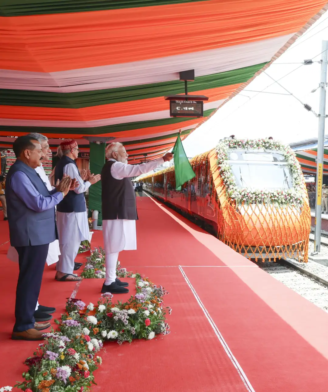 ಜಮ್ಮು-ಕಾಶ್ಮೀರದ ಕಟ್ರಾ ರೈಲು ನಿಲ್ದಾಣದಲ್ಲಿ ಪ್ರಧಾನಿ ನರೇಂದ್ರ ಮೋದಿ ಶುಕ್ರವಾರ ವಂದೇ ಭಾರತ್ ರೈಲು ಸಂಚಾರಕ್ಕೆ ಹಸಿರು ನಿಶಾನೆ ತೋರಿದರು. ಕೇಂದ್ರ ಸಚಿವರಾದ ಜಿತೇಂದ್ರ ಸಿಂಗ್ ಅಶ್ವಿನಿ ವೈಷ್ಣವ್ ಮುಖ್ಯಮಂತ್ರಿ ಒಮರ್ ಅಬ್ದುಲ್ಲಾ ಇದ್ದಾರೆ