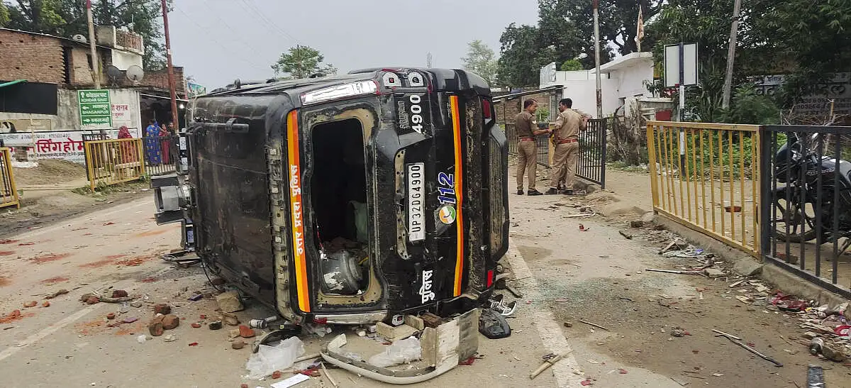 ಉದ್ರಿಕ್ತರ ಗುಂಪು ಪೊಲೀಸ್ ವಾಹನವನ್ನು ಧ್ವಂಸಗೊಳಿಸಿದೆ.
