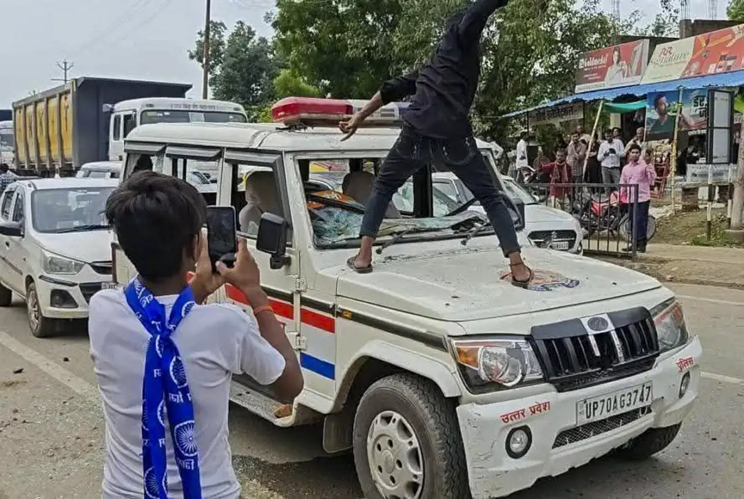 ಚಂದ್ರಶೇಖರ್ ಆಜಾದ್ ಬೆಂಬಲಿಗರು ಪೊಲೀಸ್ ವಾಹನವನ್ನು ಧ್ವಂಸಗೊಳಿಸುತ್ತಿರುವ ದೃಶ್ಯ