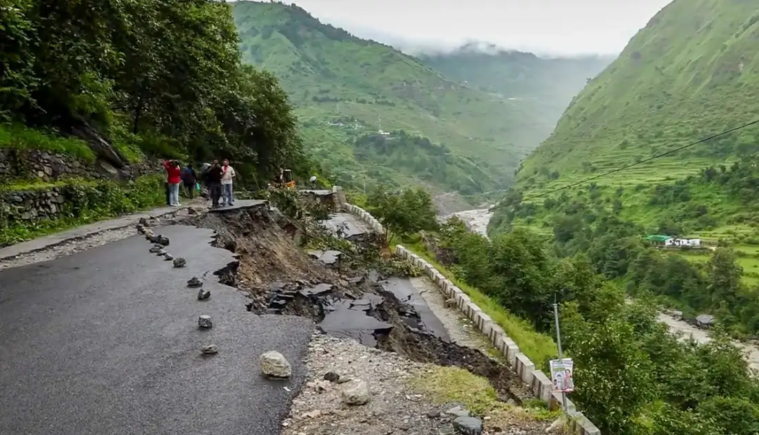 ಉತ್ತರಕಾಶಿ ಜಿಲ್ಲೆಯಲ್ಲಿ ಮೇಘಸ್ಫೋಟದಿಂದಾಗಿ ಉಂಟಾದ ದಿಢೀರ್ ಪ್ರವಾಹದಿಂದ ಭಟ್ವಾರಿ ಪಟ್ಟಣಕ್ಕೆ ಸಂಪರ್ಕ ಕಲ್ಪಿಸುವ ರಸ್ತೆ ಕುಸಿದಿದೆ ಪಿಟಿಐ ಚಿತ್ರ