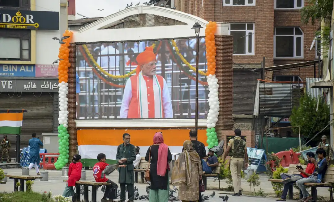 ಕೆಂಪು ಕೋಟೆಯಲ್ಲಿ ನಡೆಯುತ್ತಿದ್ದ 79ನೇ ಸ್ವಾತಂತ್ರ್ಯ ದಿನಾಚರಣೆ ಕಾರ್ಯಕ್ರಮದ ನೇರಪ್ರಸಾರವನ್ನು ಶ್ರೀನಗರದ ಲಾಲ್ಚೌಕದಲ್ಲಿ ಜನರು ವೀಕ್ಷಿಸುತ್ತಿರುವುದು.