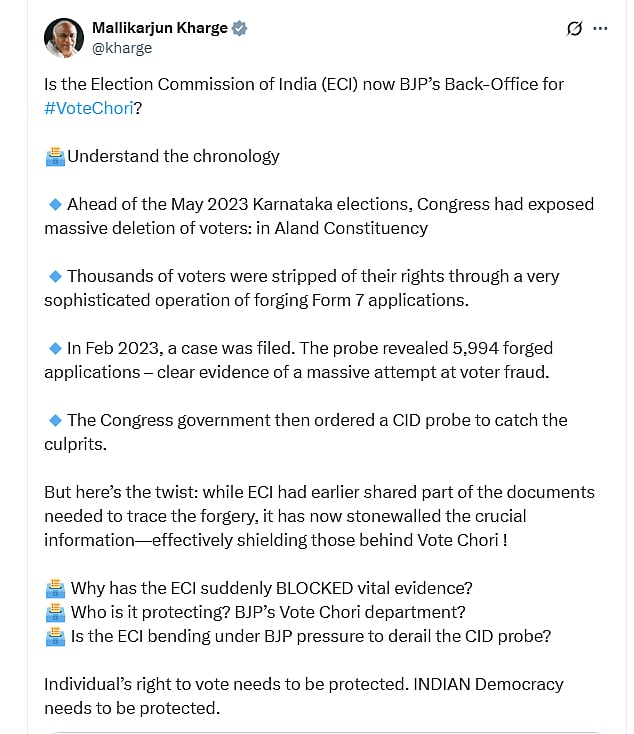 'ಆದರೆ ಇಲ್ಲೊಂದು ಟ್ವಿಸ್ಟ್ ಇದೆ: ಆರಂಭದಲ್ಲಿ ಮತ ಚೋರಿ ಹಿಂದೆ ಯಾರಿದ್ದಾರೆ ಎಂಬುದನ್ನು ಕಂಡುಹಿಡಿಯಲು ಸಹಾಯ ಮಾಡುವ ಕೆಲವು ದಾಖಲೆಗಳನ್ನು ಆಯೋಗ ಹಂಚಿಕೊಂಡಿತ್ತು. ಆದರೆ ಈಗ, ಪ್ರಕರಣವನ್ನು ಸಂಪೂರ್ಣವಾಗಿ ತನಿಖೆ ಮಾಡಲು ಅಗತ್ಯವಾದ ಪ್ರಮುಖ ಮಾಹಿತಿಯನ್ನು ಹಂಚಿಕೊಳ್ಳುವುದನ್ನು ಮರೆಮಾಚಿದೆ. ವೋಟ್ ಚೋರಿಯ ಹಿಂದೆ ಇರುವವರನ್ನು ರಕ್ಷಿಸುತ್ತಿದೆ!. ಇಸಿಐ ಇದ್ದಕ್ಕಿದ್ದಂತೆ ಪ್ರಮುಖ ಸಾಕ್ಷ್ಯಗಳನ್ನು ಏಕೆ ಮರೆಮಾಚಿದೆ' ಎಂದು ಖರ್ಗೆ ಪ್ರಶ್ನಿಸಿದರು.
