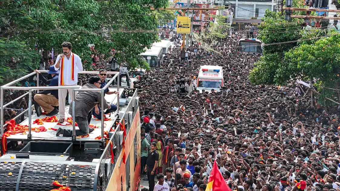 ಮಹಿಳೆಯರು ಸೇರಿದಂತೆ ಜನಸಾಗರವೇ ಹರಿದುಬರುತ್ತಿದ್ದಂತೆ ವಿಜಯ್ ಅವರ ಪ್ರಚಾರದ ವಾಹನ ನಿಧಾನಗತಿಯಲ್ಲಿ ಸಾಗಿತು. ವಿಜಯ್ ಬಸ್ನೊಳಗಿನಿಂದಲೇ ಕಾರ್ಯಕರ್ತರತ್ತ ಕೈಬೀಸಿದರು. ಅನೇಕರು ಪಕ್ಷದ ಧ್ವಜಗಳನ್ನು ಬೀಸಿದರು. ವಿಜಯ್ ಅವರ ಭಾವಚಿತ್ರಗಳನ್ನು ಪ್ರದರ್ಶಿಸುವ ಮೂಲಕ ಸ್ವಾಗತ ಕೋರಿದರು.