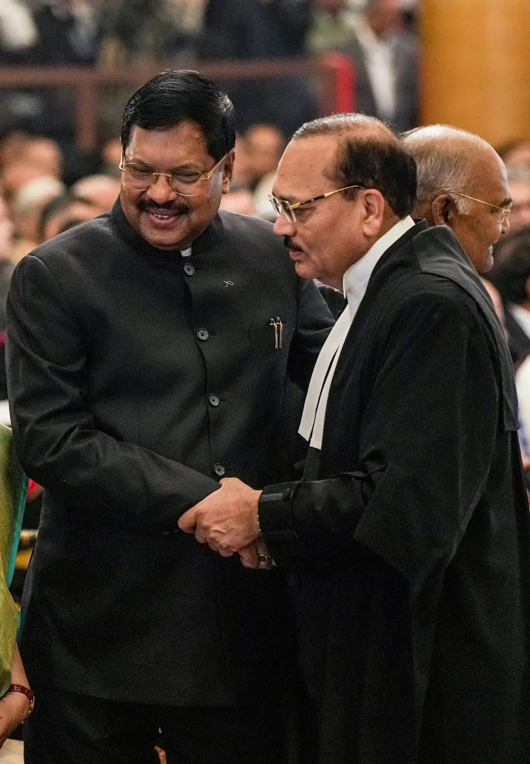 ಹಿಂದಿನ ಸಿಜೆಐ ಬಿ.ಆರ್. ಗವಾಯಿ ಅವರು ನೂತನ ಸಿಜೆಐ ಅವರಿಗೆ ಶುಭಾಶಯ ಕೋರಿದ ಕ್ಷಣ -ಪಿಟಿಐ ಚಿತ್ರ.