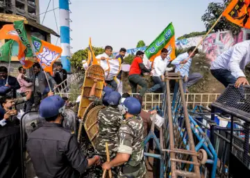 ಹೌರಾ ಸೇತುವೆ ಬಳಿ ಬ್ಯಾರಿಕೇಡ್ಗಳನ್ನು ಹತ್ತಿ ಮುನ್ನುಗ್ಗಿದ ಬಿಜೆಪಿ ಕಾರ್ಯಕರ್ತರನ್ನು ಪೊಲೀಸರು ತಡೆಯಲು ಪ್ರಯತ್ನಿಸಿದರು -ಪಿಟಿಐ ಚಿತ್ರಗಡಿ ಭಾಗದಲ್ಲಿ ಪ್ರತಿಭಟನೆ