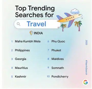 ಗೂಗಲ್ನಲ್ಲಿ ಜನರು ಪ್ರಯಾಗ್ರಾಜ್ನಲ್ಲಿ ಮಹಾಕುಂಭ ಮೇಳಕ್ಕೆ ಹೋಗುವ ಬಗ್ಗೆ ಜನರು ಹೆಚ್ಚು ಹುಡುಕಾಡಿದ್ದಾರೆ. ಇದಲ್ಲದೆ ಮಾರಿಷಸ್, ಫಿಲಿಪ್ಪೀನ್ಸ್ ಬಗ್ಗೆ ಹುಡುಕಾಟ ನಡೆಸಿದ್ದಾರೆ.