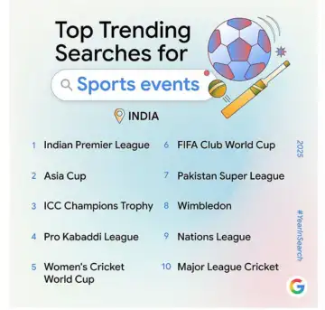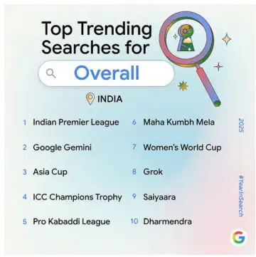 ಒಟ್ಟಾರೆಯಾಗಿ ಐಪಿಎಲ್, ಗೂಗಲ್ ಜೆಮಿನಿ, ಏಷ್ಯಾ ಕಪ್, ಐಸಿಸಿ ಚಾಂಪಿಯನ್ ಟ್ರೋಫಿ, ಪ್ರೊ ಕಬ್ಬಡಿ ಲೀಗ್ಗಳು 2025ರಲ್ಲಿ ಗೂಗಲ್ನಲ್ಲಿ ಅತಿ ಹೆಚ್ಚು ಸರ್ಚ್ ಆದ ವಿಷಯಗಳಾಗಿವೆ.