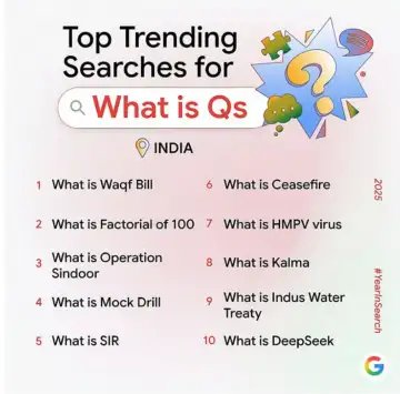 ಭಾರತದಲ್ಲಿ ಅನೇಕ ಹೊಸತು, ವಿಶೇಷ ಘಟನೆಗಳು ನಡೆದಿವೆ. ಅವುಗಳ ಬಗ್ಗೆ ಗೂಗಲ್ನಲ್ಲಿ ಜನರು ಆಪರೇಷನ್ ಸಿಂಧೂರ ಎಂದರೇನು, ವಕ್ಫ್ ಮಸೂದೆ ಎಂದರೇನು, ಮತದಾರರ ಪಟ್ಟಿಯ ವಿಶೇಷ ಸಮಗ್ರ ಪರಿಷ್ಕರಣೆ (ಎಸ್ಐಆರ್) ಎಂದರೇನು ಎನ್ನುವದನ್ನೆಲ್ಲಾ ಹುಡುಕಾಡಿದ್ದಾರೆ.