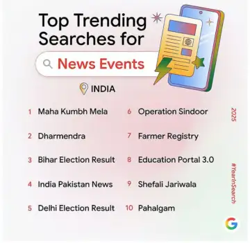 ದೇಶದಲ್ಲಿ ಈ ವರ್ಷ ಅನೇಕ ಪ್ರಮುಖ ಘಟನೆಗಳು ನಡೆದಿವೆ. ಅವುಗಳಲ್ಲಿ ಬಳಕೆದಾರರು ಹುಡುಕಾಡಿದ್ದು, ಮಹಾಕುಂಭ ಮೇಳ, ಧರ್ಮೇಂದ್ರ ಕುರಿತಾದ ಸುದ್ದಿಗಳು, ಬಿಹಾರ- ದೆಹಲಿ ಚುನಾವಣೆ, ಭಾರತ- ಪಾಕಿಸ್ತಾನ ಕುರಿತಾದ ಸುದ್ದಿಗಳು, ಆಪರೇಷನ್ ಸಿಂಧೂರ್ ಕುರಿತ ಸುದ್ದಿಗಳನ್ನು ಹೆಚ್ಚು ಹುಡುಕಾಡಿದ್ದಾರೆ.