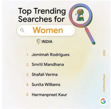 ಈ ವರ್ಷ ದೇಶದಲ್ಲಿ ಅನೇಕ ಕ್ಷೇತ್ರಗಳಲ್ಲಿ ಮಹಿಳೆಯರು ಅಭೂತಪೂರ್ವ ಸಾಧನೆ ಮಾಡಿದ್ದಾರೆ. ಅವರುಗಳ ಪೈಕಿ ಗೂಗಲ್ನಲ್ಲಿ ಮಹಿಳಾ ಕ್ರಿಕೆಟ್ ಆಟಗಾರ್ತಿಯರಾದ ಸ್ಮೃತಿ ಮಂದಾನ, ಶೆಫಾಲಿ ವರ್ಮ, ಹರ್ಮನ್ಪ್ರೀತ್ ಕೌರ್ ಬಗ್ಗೆ ಹೆಚ್ಚು ಗೂಗಲ್ನಲ್ಲಿ ಹುಡುಕಾಡಿದ್ದಾರೆ.