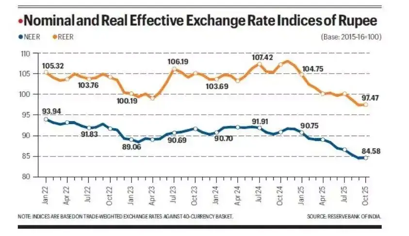 2018-19ರಿಂದ ನೀರ್ ಸೂಚ್ಯಂಕವು 100ಕ್ಕಿಂತ ಕೆಳಗೆ ಇದೆ. ಮೌಲ್ಯ 90 ಎಂದರೆ ರೂಪಾಯಿ ತನ್ನ ಮುಖ್ಯ ವಹಿವಾಟು ಪಾಲುದಾರರ ಜೊತೆಗೆ 2015-16ರಿಂದೀಚೆಗೆ ಶೇ 10ರಷ್ಟು ಮೌಲ್ಯ ಕುಸಿದಿದೆ ಎಂದು ಅರ್ಥ ಮಾಡಿಕೊಳ್ಳಬೇಕು. ಆದರೆ, ಈ ವರ್ಷದ ಆರಂಭದವರೆಗೂ ನೀರ್ 90ರ ಆಸುಪಾಸಿನಲ್ಲಿಯೇ ಇತ್ತು. ಆದರೆ ಜನವರಿ 2022 ಮತ್ತು ಜನವರಿ 2025 ನಡುವೆ 93.94ರಿಂದ 90.75ಗೆ ಕುಸಿದಿತ್ತು. ಅಂದರೆ ಶೇ 3.4% ಕುಸಿತ. ಆದರೆ ಮುಂದುವರಿದು 2025 ಅಕ್ಟೋಬರ್ ಗೆ ಇದು 84.58ಗೆ ಬಂದು ನಿಂತಿದೆ. ಅಂದರೆ 9 ತಿಂಗಳಲ್ಲಿ ಶೇ 6.8ರಷ್ಟು ಕುಸಿತ ಕಂಡಿದೆ.