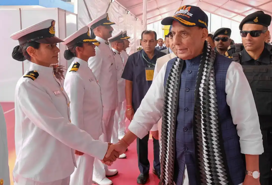 ಕರಾವಳಿ ಪಡೆಗೆ 'ಸಮುದ್ರ ಪ್ರತಾಪ್' ನೌಕೆಯನ್ನು ಸೇರ್ಪಡೆಗೊಳಿಸುವ ಸಮಾರಂಭದಲ್ಲಿ ಭಾಗಿಯಾದ ರಕ್ಷಣಾ ಸಚಿವ ರಾಜನಾಥ್ ಸಿಂಗ್ ಅವರು ನೌಕಾಪಡೆಯ ಮಹಿಳಾ ಅಧಿಕಾರಿಗೆ ಹಸ್ತಲಾಘವ ನೀಡಿದರು