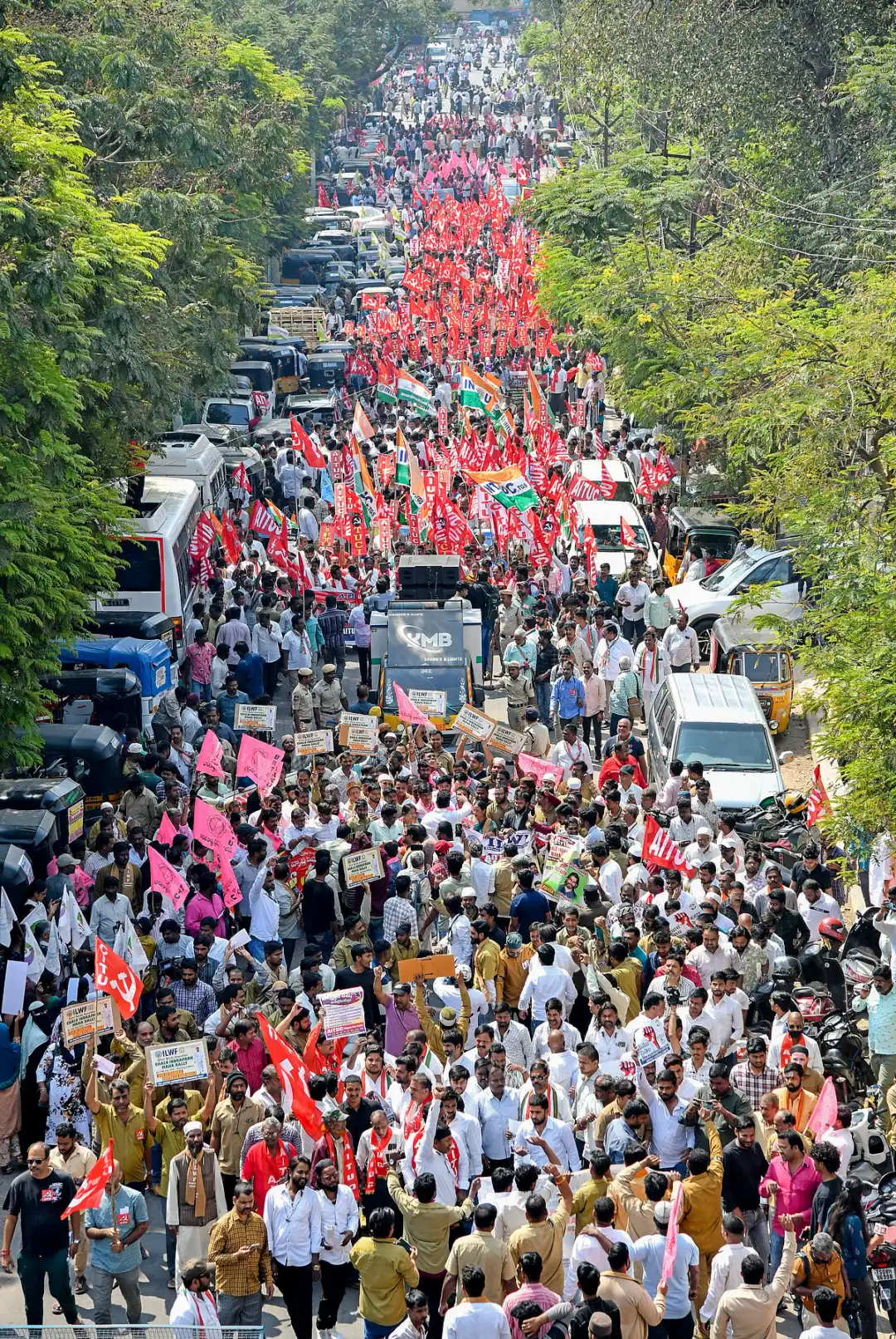 ನಾಲ್ಕು ಕಾರ್ಮಿಕ ಸಂಹಿತೆಗಳನ್ನು ಹಿಂಪಡೆಯುವಂತೆ ಒತ್ತಾಯಿಸಿ ಹೈದರಾಬಾದ್ನಲ್ಲಿ ಎಡಪಕ್ಷಗಳ ಜಂಟಿ ವೇದಿಕೆ ಕರೆ ನೀಡಿದ್ದ ಪ್ರತಿಭಟನೆಯಲ್ಲಿ ಸಾವಿರಾರು ಕಾರ್ಮಿಕರು ಭಾಗವಹಿಸಿದ್ದರು.