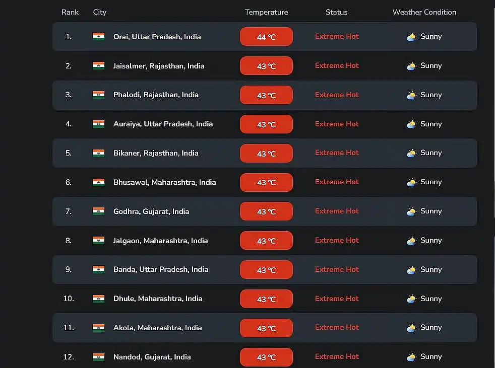 ಸಾಮಾನ್ಯಕ್ಕಿಂತ ಹೆಚ್ಚಿನ ತಾಪಮಾನವನ್ನು ದಾಖಲಿಸುವ ನಗರಗಳಲ್ಲಿ ಉತ್ತರ ಪ್ರದೇಶದ ಒರೈ ಮತ್ತು ಔರೈಯಾ, ರಾಜಸ್ಥಾನದ ಜೈಸಲ್ಮೇರ್ ಮತ್ತು ಫಲೋಡಿ ಸೇರಿವೆ.