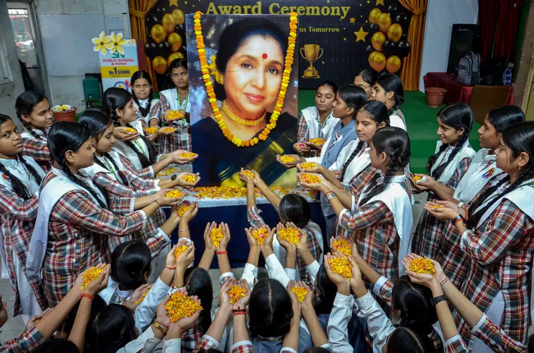 ಮಿರ್ಜಾಪುರದಲ್ಲಿ ಹಿನ್ನೆಲೆ ಗಾಯಕಿ ಆಶಾ ಭೋಸ್ಲೆ ಅವರ ಭಾವಚಿತ್ರಕ್ಕೆ ವಿದ್ಯಾರ್ಥಿನಿಯರು ಪುಷ್ಪನಮನ ಸಲ್ಲಿಸಿದರು -ಪಿಟಿಐ ಚಿತ್ರ