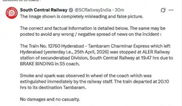 ಈ ಕುರಿತು ಸಾಮಾಜಿಕ ಮಾಧ್ಯಮ ಎಕ್ಸ್ನಲ್ಲಿ ಪೋಸ್ಟ್ ಹಂಚಿಕೊಂಡಿರುವ ದಕ್ಷಿಣ ಮಧ್ಯ ರೈಲ್ವೆ, ಬ್ರೇಕ್ ಬೈಂಡಿಂಗ್ನಿಂದಾಗಿ ಈ ಸಣ್ಣ ಅವಘಡ ಸಂಭವಿಸಿದೆ. ಘಟನೆಯಲ್ಲಿ ಯಾವುದೇ ಆಸ್ತಿ ಪಾಸ್ತಿ ನಷ್ಟ ಅಥವಾ ಯಾರಿಗೂ ಗಾಯಗಳಾಗಿಲ್ಲ. ಪ್ರಯಾಣಿಕರು ಸುರಕ್ಷಿತವಾಗಿದ್ದು, ರೈಲು ತನ್ನ ಮುಂದಿನ ಪ್ರಯಾಣ ಬೆಳೆಸಿತು ಎಂದು ಅದು ತಿಳಿಸಿದೆ.