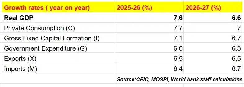 ಸಂಘರ್ಷದ ಅನುಪಸ್ಥಿತಿಯಲ್ಲಿ, ಜಿಡಿಪಿ ಬೆಳವಣಿಗೆಯನ್ನು ಶೇಕಡಾ 7.2 ಎಂದು ಅಂದಾಜಿಸಲಾಗಿದೆ. ಮಧ್ಯಪ್ರಾಚ್ಯ ಸಂಘರ್ಷದ ಹಿನ್ನಡೆಗಳನ್ನು ಪ್ರತಿಬಿಂಬಿಸುವ ಮೂಲಕ, 2026 ರ ಅಂತ್ಯದವರೆಗೆ ಜಾಗತಿಕ ಇಂಧನ (ತೈಲ ಮತ್ತು ಅನಿಲ) ಪೂರೈಕೆಯಲ್ಲಿ ದೊಡ್ಡ ಮಟ್ಟದ ಅಡಚಣೆ ಉಂಟಾಗಬಹುದು ಎಂದು ಊಹಿಸಿ, ಹಣಕಾಸು ವರ್ಷ 2027 ರಲ್ಲಿ ಬೆಳವಣಿಗೆಯನ್ನು ಈಗ ಶೇಕಡಾ 6.6 ಎಂದು ಅಂದಾಜಿಸಲಾಗಿದೆ ಎಂದು ವಿಶ್ವ ಬ್ಯಾಂಕ್ ಹೇಳಿದೆ.